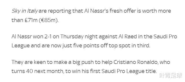 利雅得奏效莫得毁掉。天外体育浮现,沙特土豪奉上新的报价,总价值超越7100万英镑(8500万欧元)!奏效但愿引进顶级好手,匡助行将40岁的C罗终了沙职联冠军指标。
