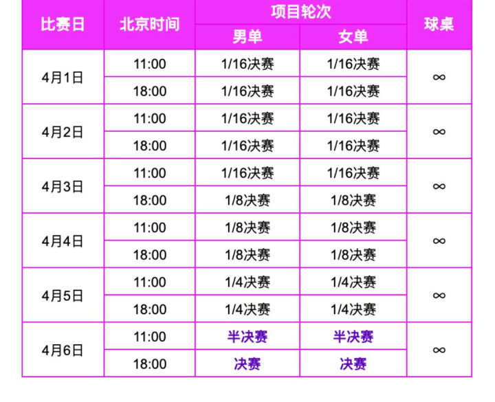 WTT仁川冠军赛4月1日开赛,目下的比赛赛程依然公布。在4月1日到4月3日上昼11点,这两天半的时候要举行1/16的比赛。此次仁川冠军赛分两个时候段举行比赛体育集锦,每天都是上昼11点当先开赛,然后即是晚间18点开赛。4月5日是举行1/4的比赛,而在4月6日将举行半决赛跟决赛。