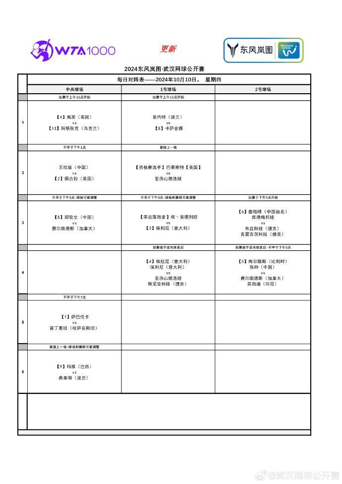 武汉网球公开赛本日迎来多场精彩对决,中国选手郑钦文、王欣瑜镇守日场,萨巴伦卡晚场登场。