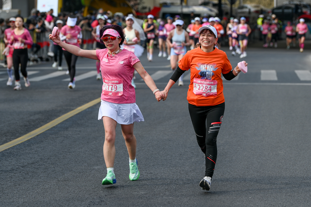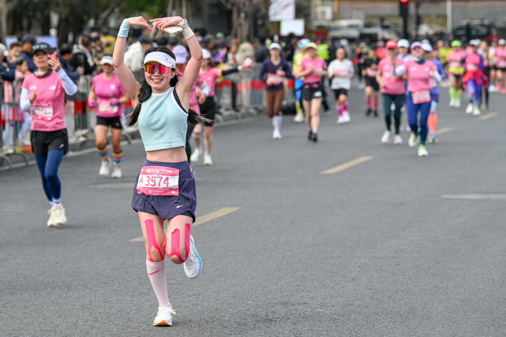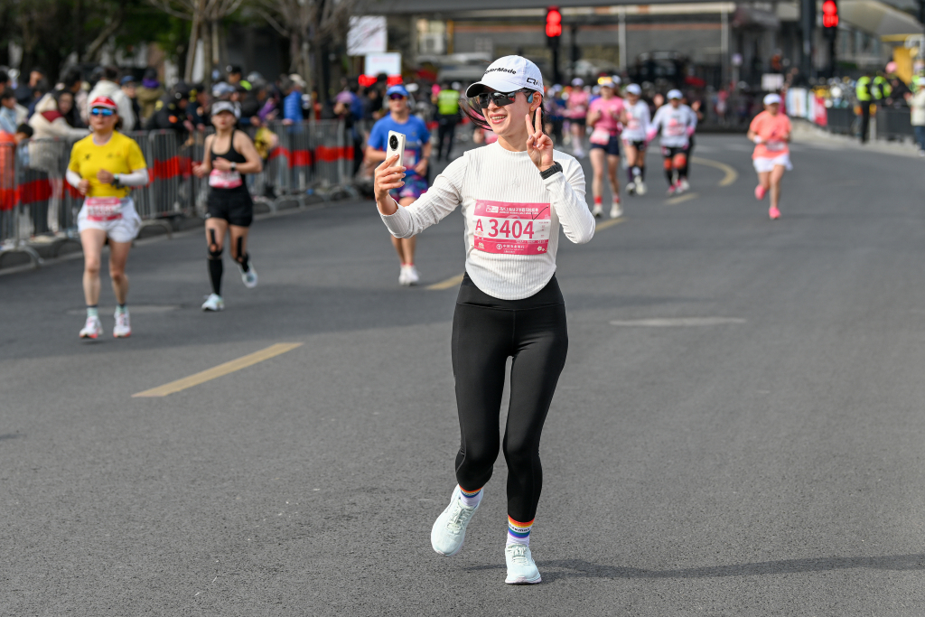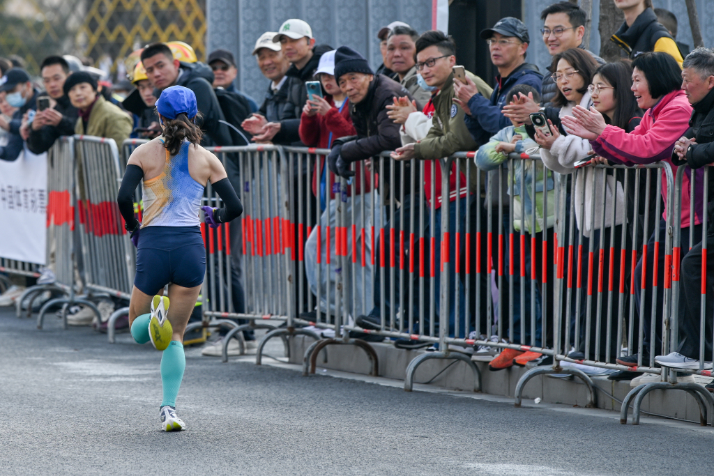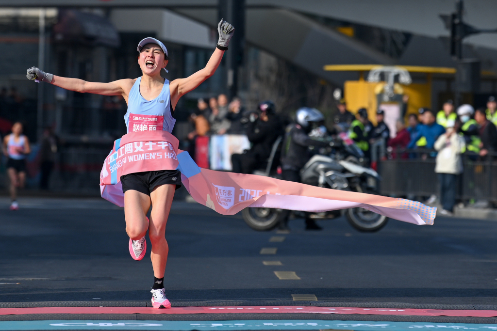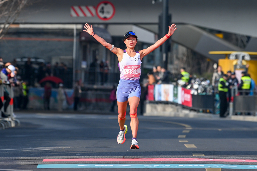 2025年3月9日,上海,赵美艳以1小时15分49秒的得益第一个冲过绝顶线。倾盆新闻记者 朱伟辉 图