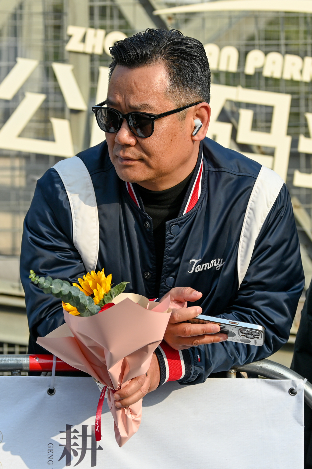 2025年3月9日,上海,王先生拿着鲜花,在绝顶处等候投入比赛的爱东谈主“我爱东谈主心爱跑步,她投入比赛唯有我有空齐会过来陪她”。倾盆新闻记者 朱伟辉 图