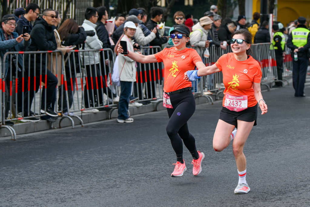 2025年3月9日,上海,赛后,来自杭州的陈晗(左)和一又友在拍照打卡。倾盆新闻记者 朱伟辉 图