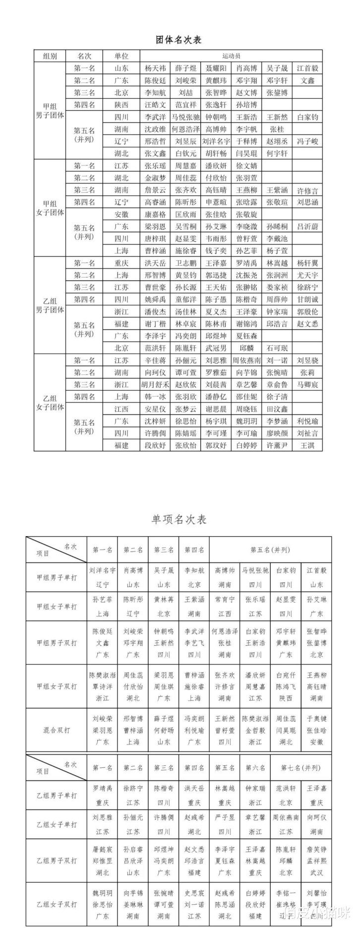甲组男双冠军则被广东队的陈俊廷/文鑫组合赢得,他们以2-0的比分降服了队友刘峻荣/邓宇翔,献技了一场精彩的内战。浙江队的陈樊淑湉/覃诗洋组合夺得甲组女双冠军,而广东队的刘峻荣/梁羽恩组合则赢得了甲组混双冠军。广东队在单项赛中展现了高大的实力,赢得了三个单项冠军。