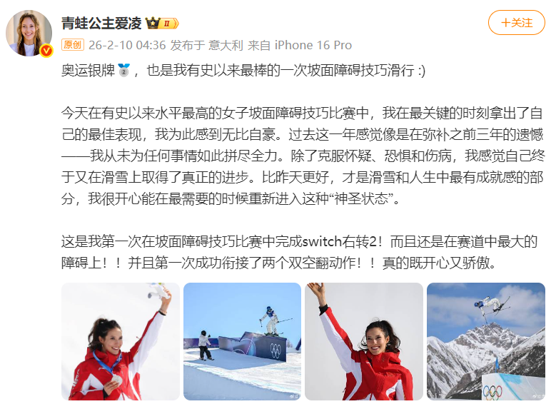 2月10日,谷爱凌在其社媒发文:奥运银牌,亦然我有史以来最棒的一次坡面构陷手段滑行。